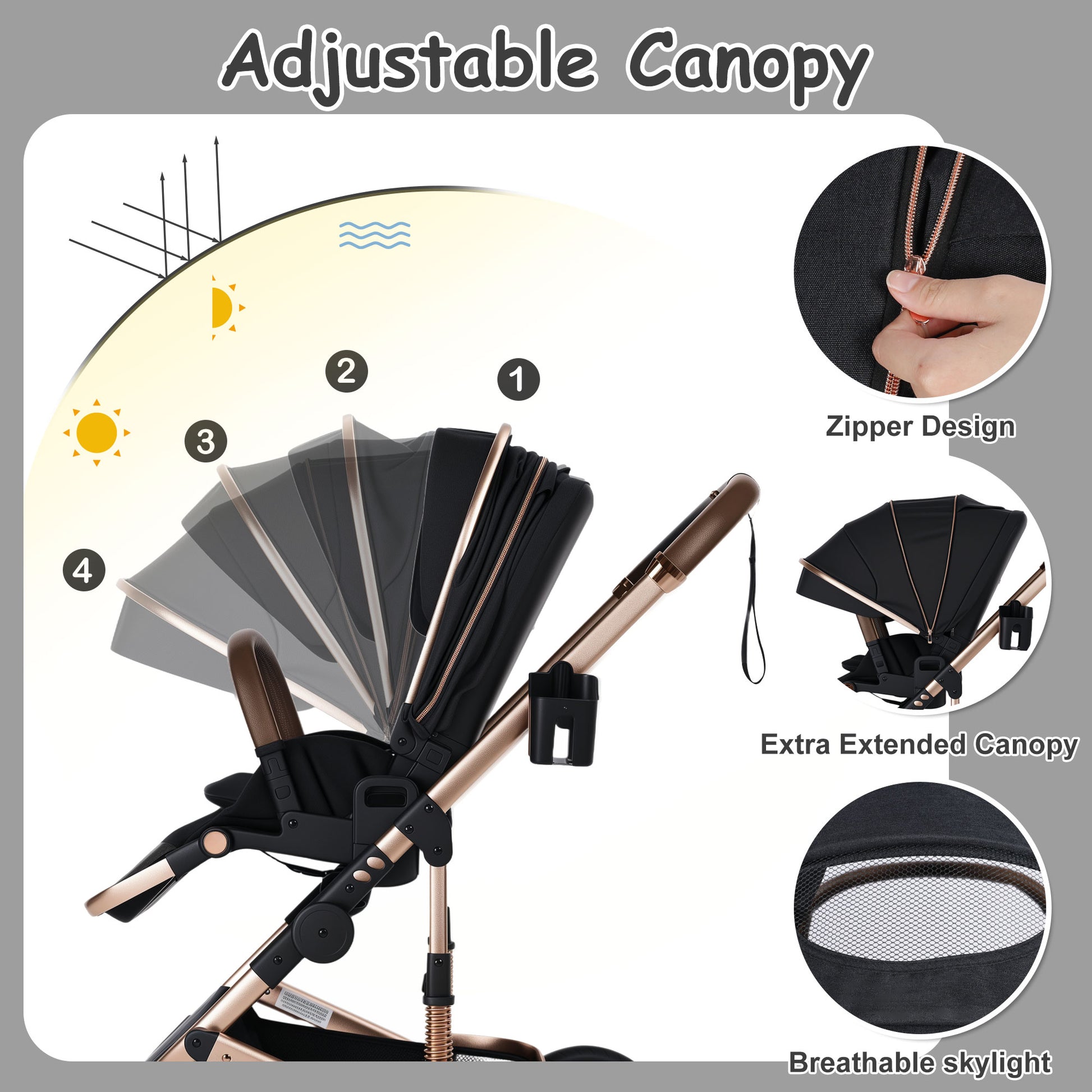 - Adjustable 4-position canopy for sun protection and 5-position footrest angles