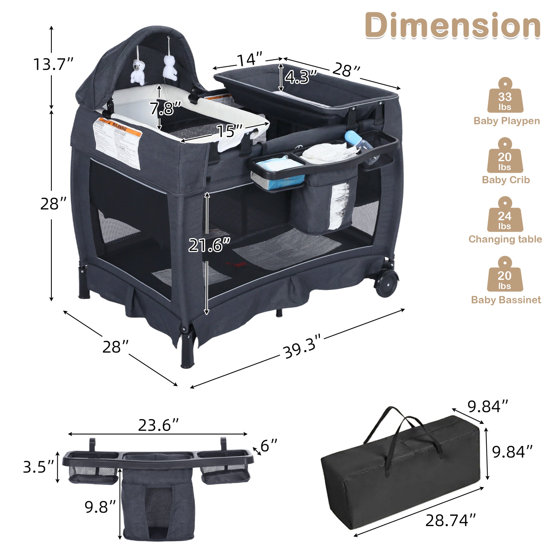 AILEEKISS 3-in-1 Nursery Center, Foldable Baby Playard with Changing Table for Newborn, Dark Grey