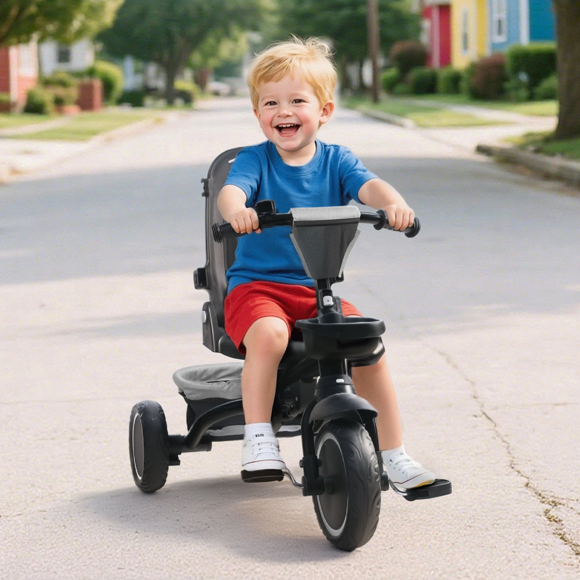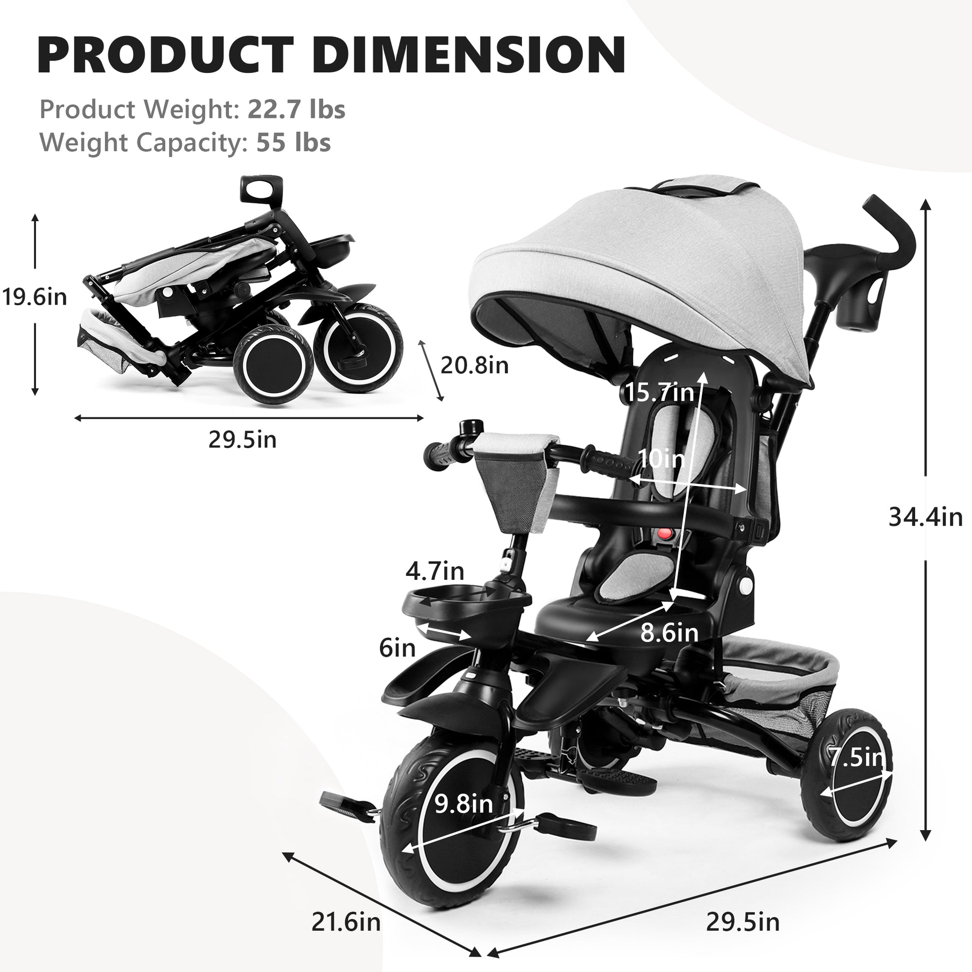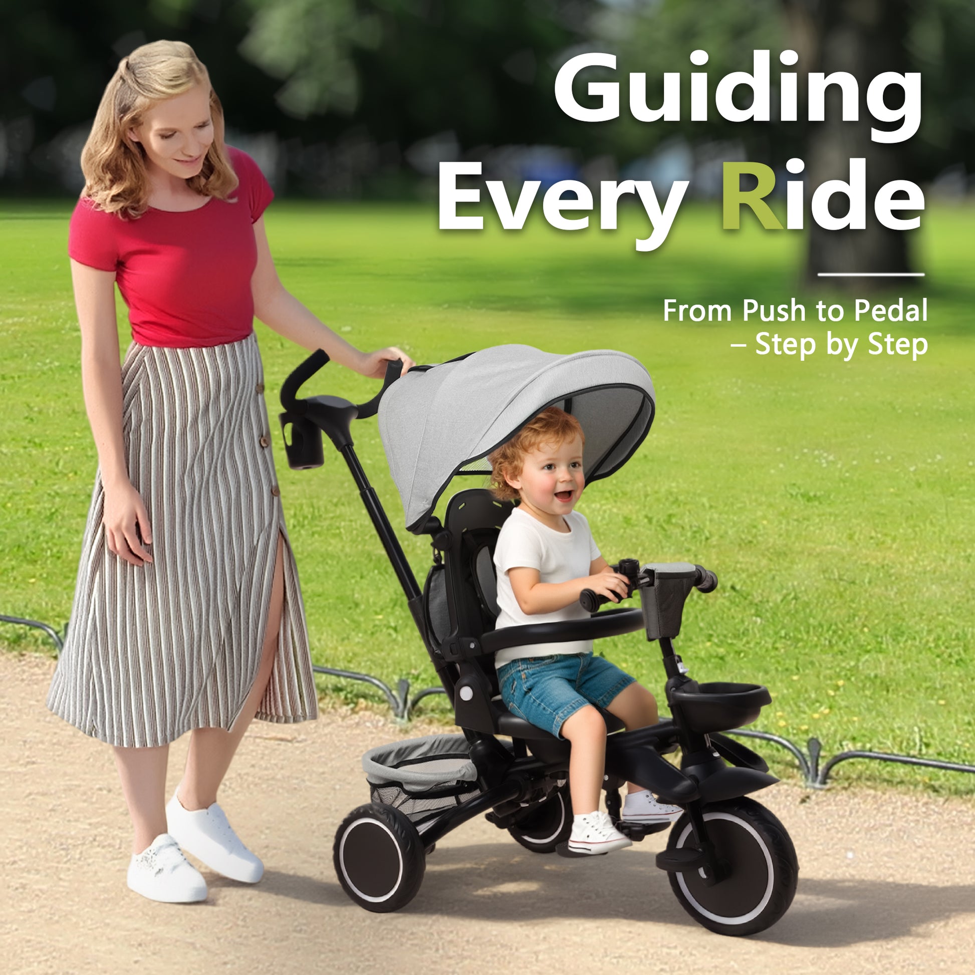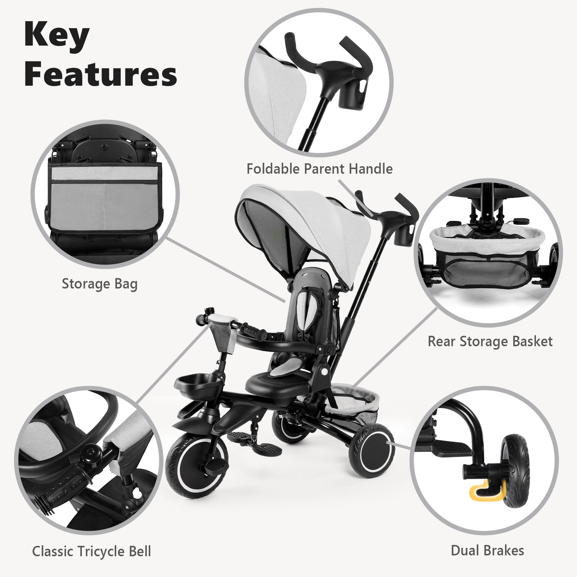 AILEEKISS 8-in-1 Kids' Tricycle Stroller, Folding Toddler Bicycle Unisex Ride Trike 1-6 Years, Light Grey