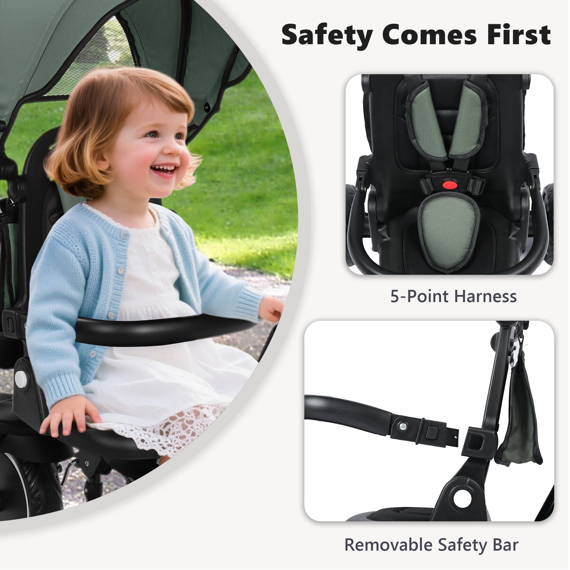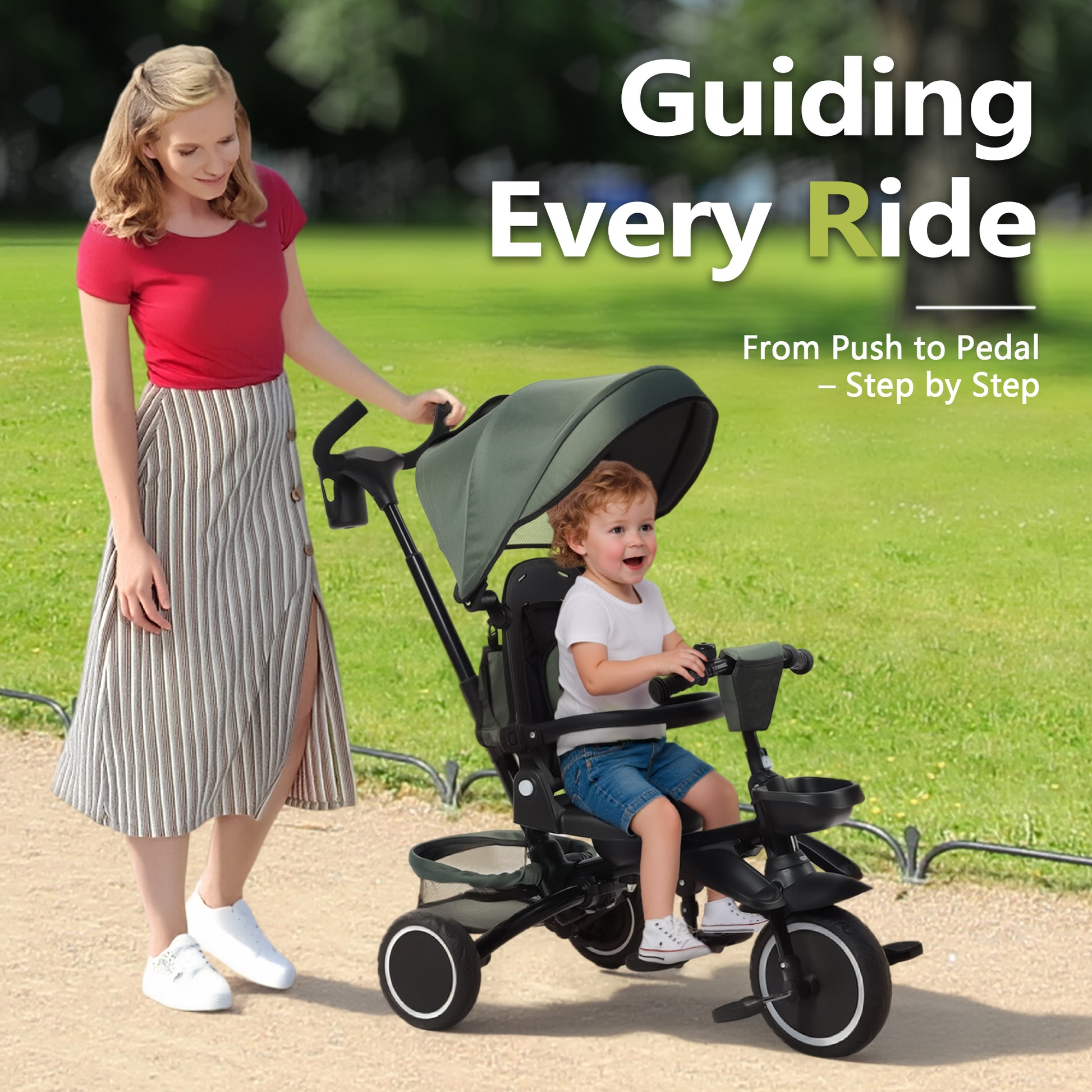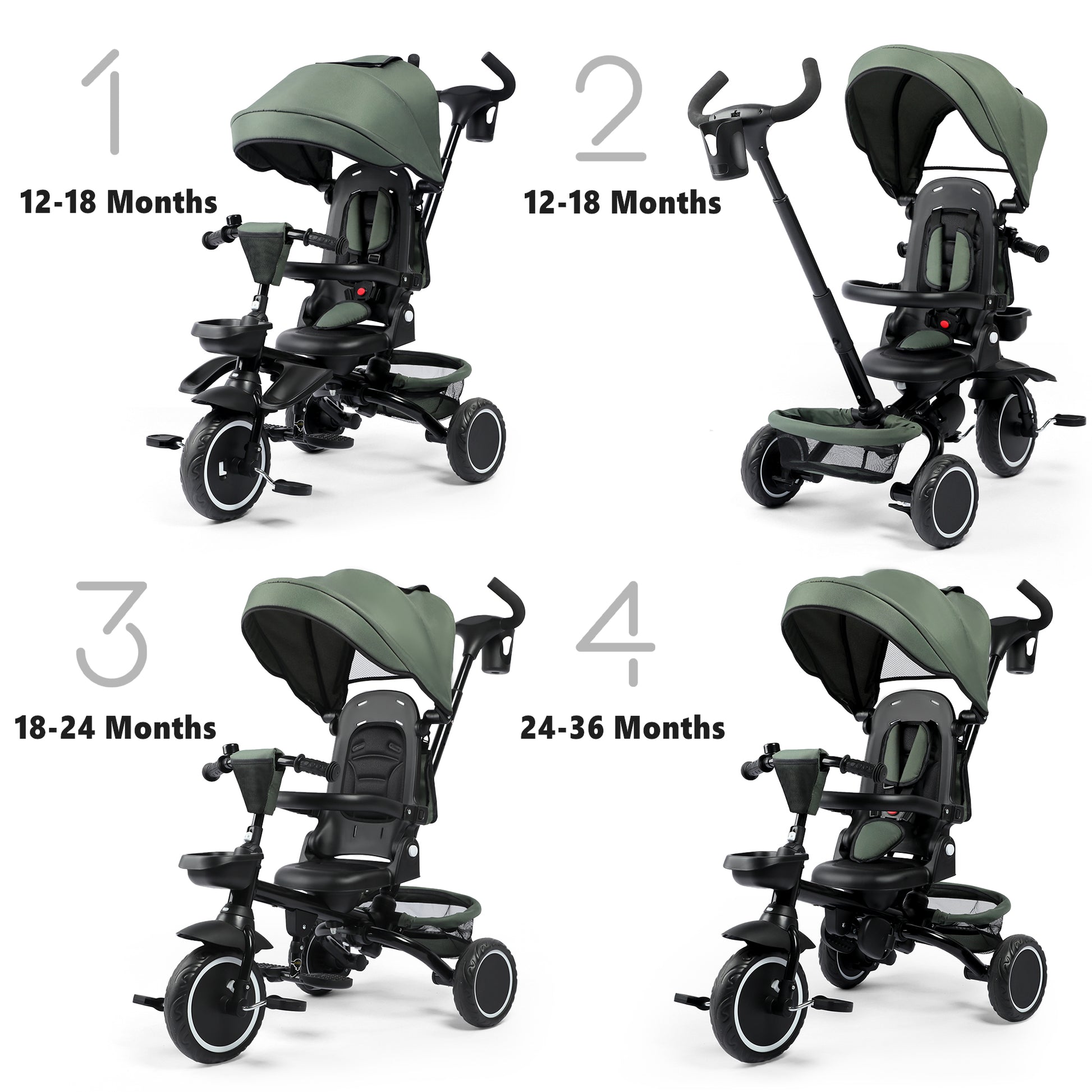 AILEEKISS 8-in-1 Kids' Tricycle Stroller, Folding Toddler Bicycle Unisex Ride Trike 1-6 Years, Military Green