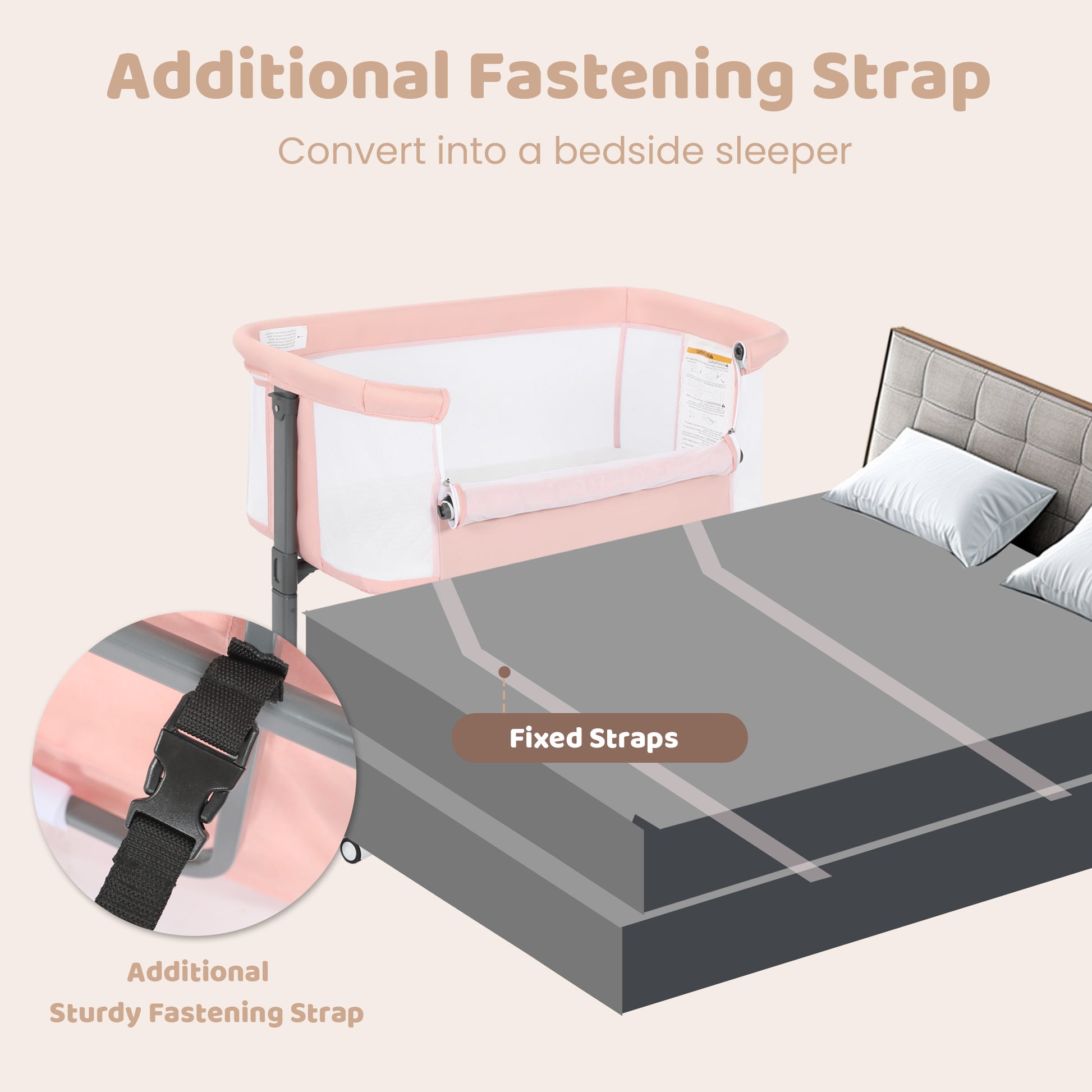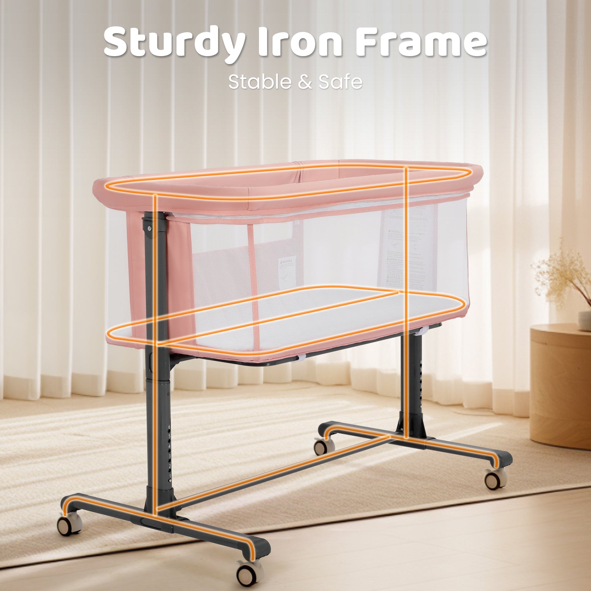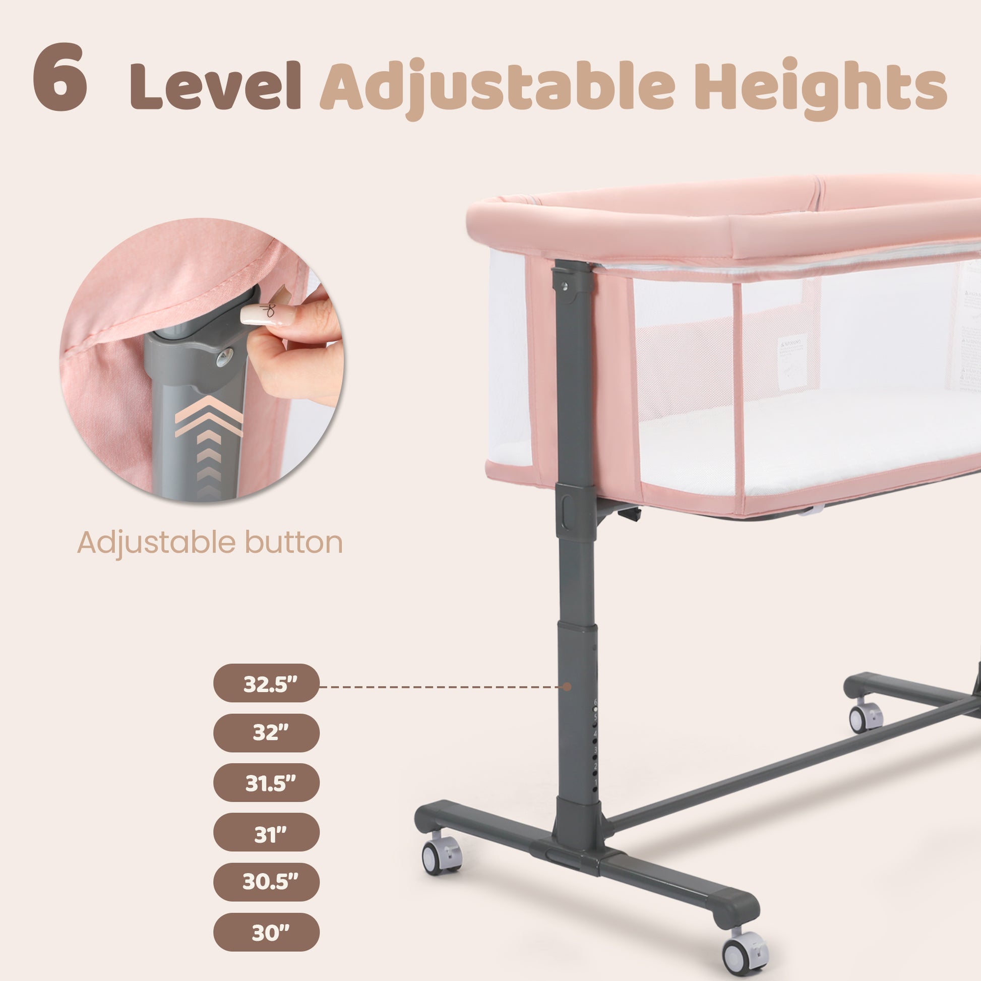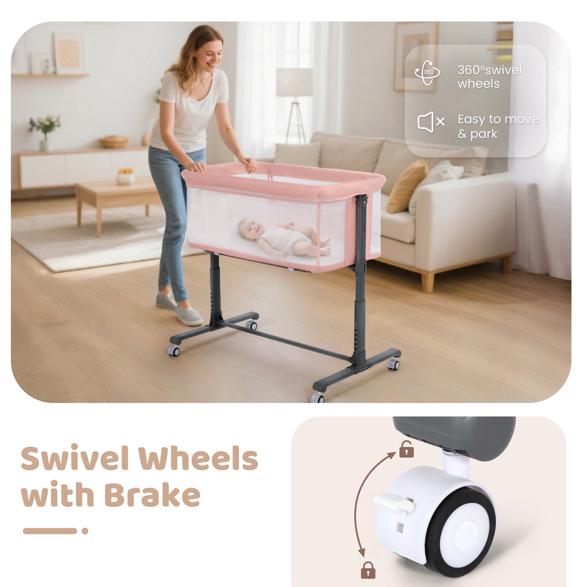AILEEKISS Baby Bassinet Bedside Sleeper, Height Adjustable Newborn Baby Bassinet with Wheels, Pink