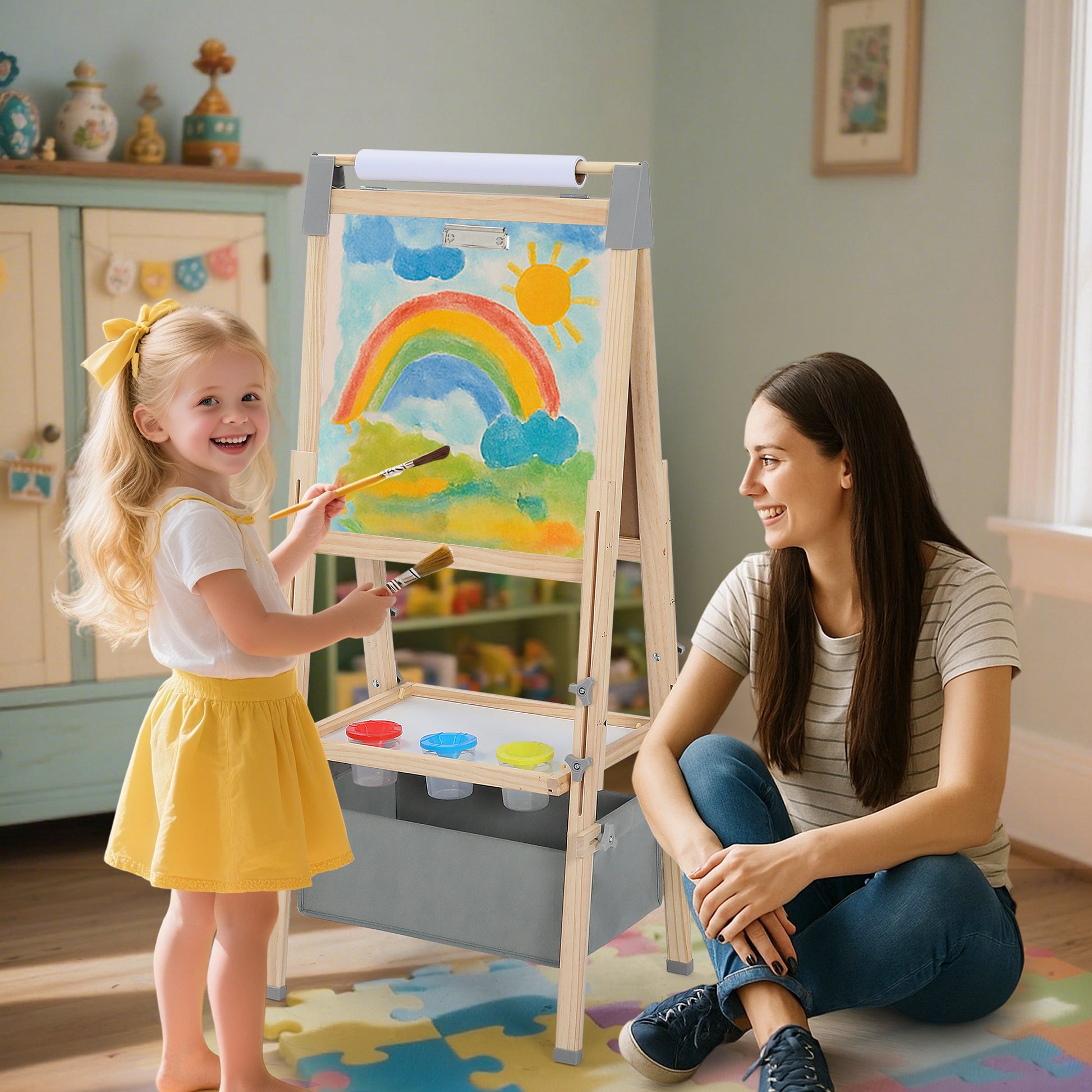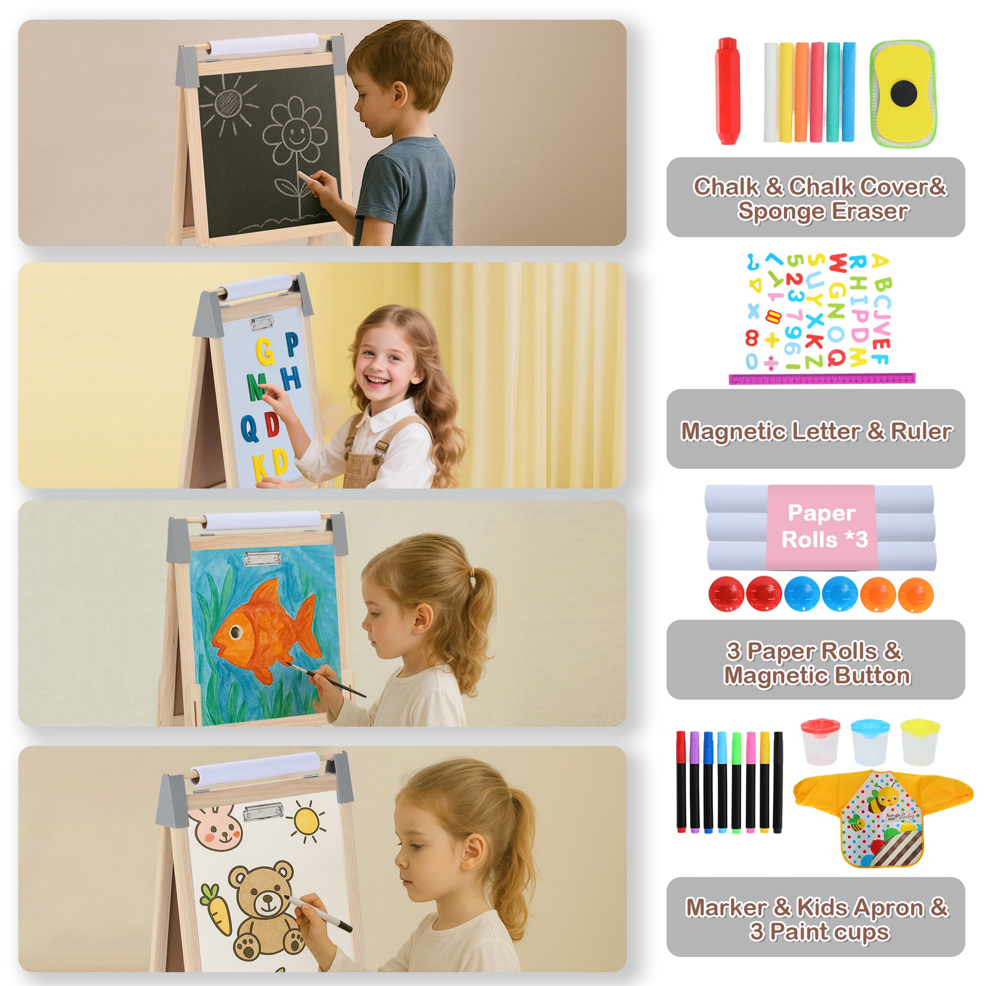 LINLUX Double-Sided Art Easel for Kids, 3 in 1 Wooden Kids Easel w/Paper Roller & Art Supplies, Grey