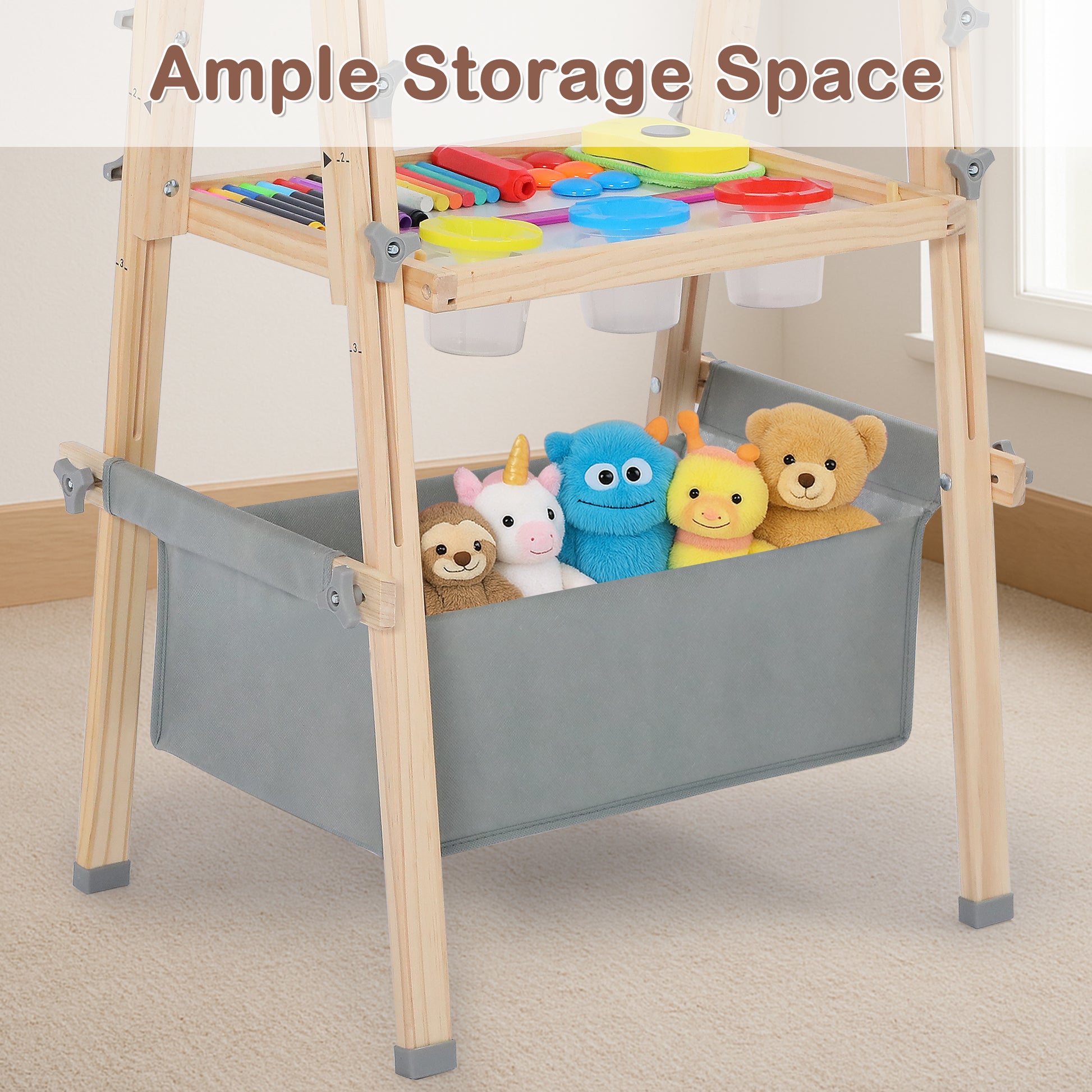 - Designed with a spacious middle tray for easy access to art supplies and a large storage basket at the bottom for toys and books.