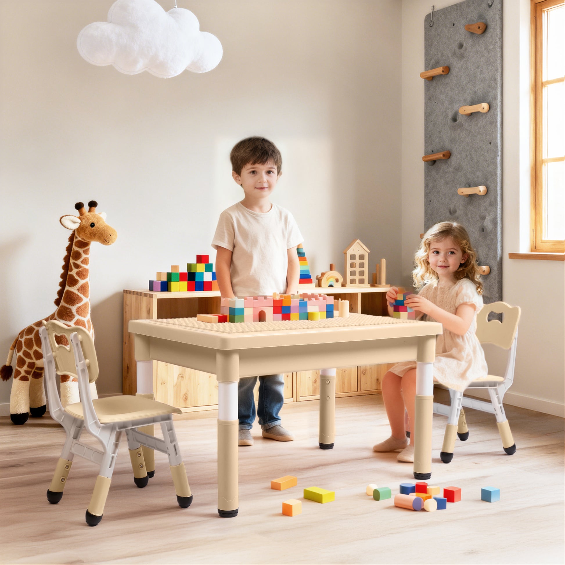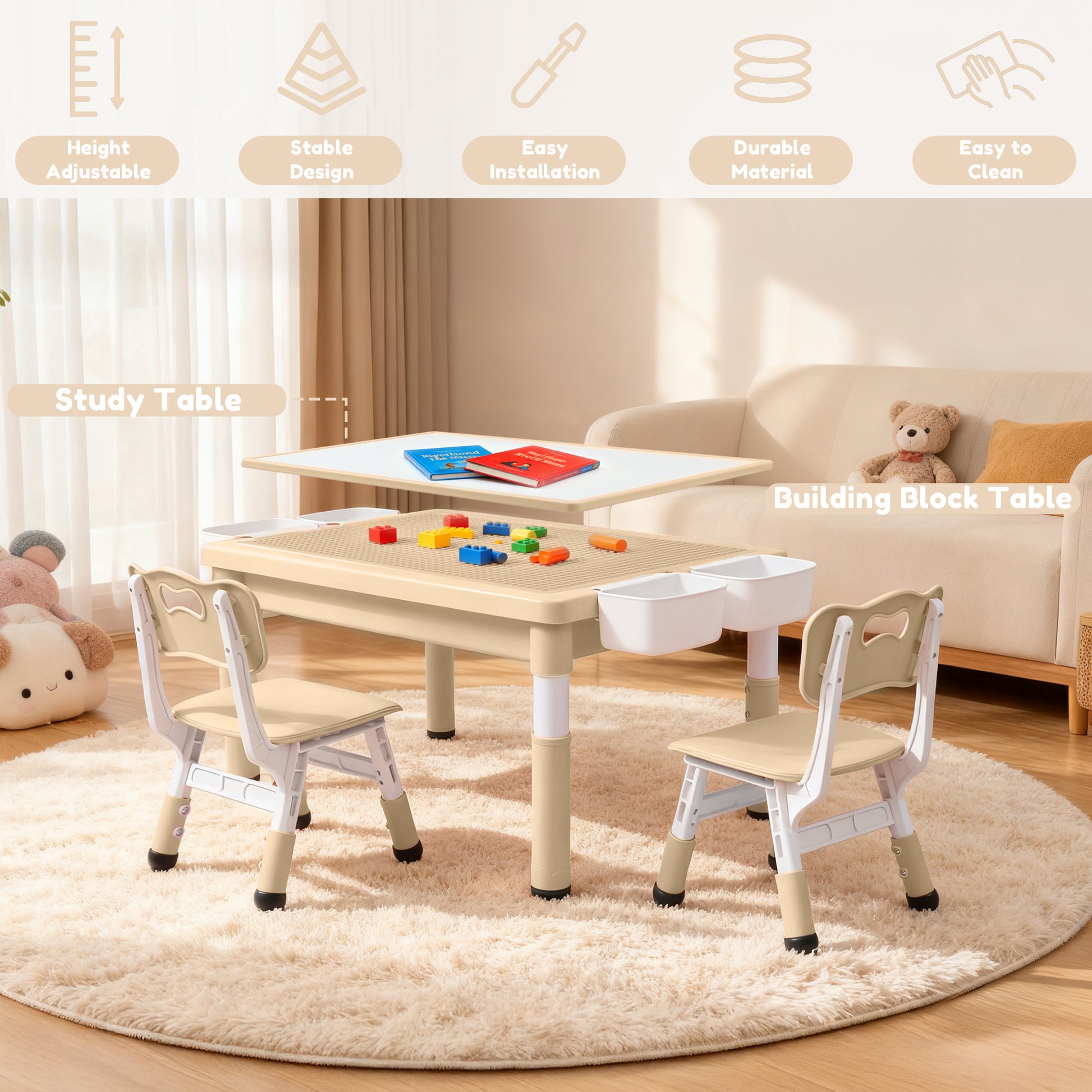 LINLUX 3 in 1 children play table comes with a table and two chairs, which is suitable for children ages 3 and above. This 3 in 1 multifunctional activity table set can be used as a build block table or study table. A large inner storage space is created for toys, books, and building blocks beneath the surface. The kids-firendly PP activity table and chair set provides great fun for kids.